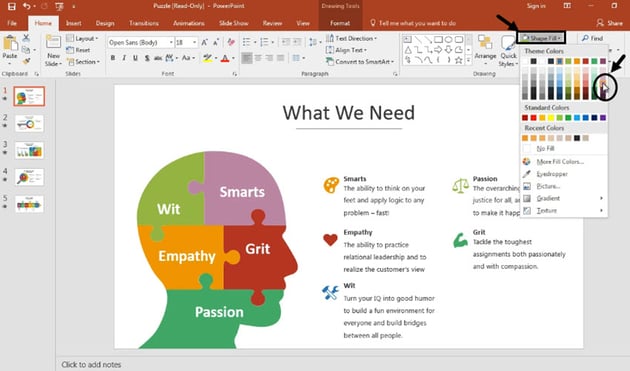 You can customize the infographic further by clicking on individual elements in the diagram and changing the color using the Drawing Tools > Shape Fill option. Select a piece and use the Shape field drop-down to experiment with different colors.